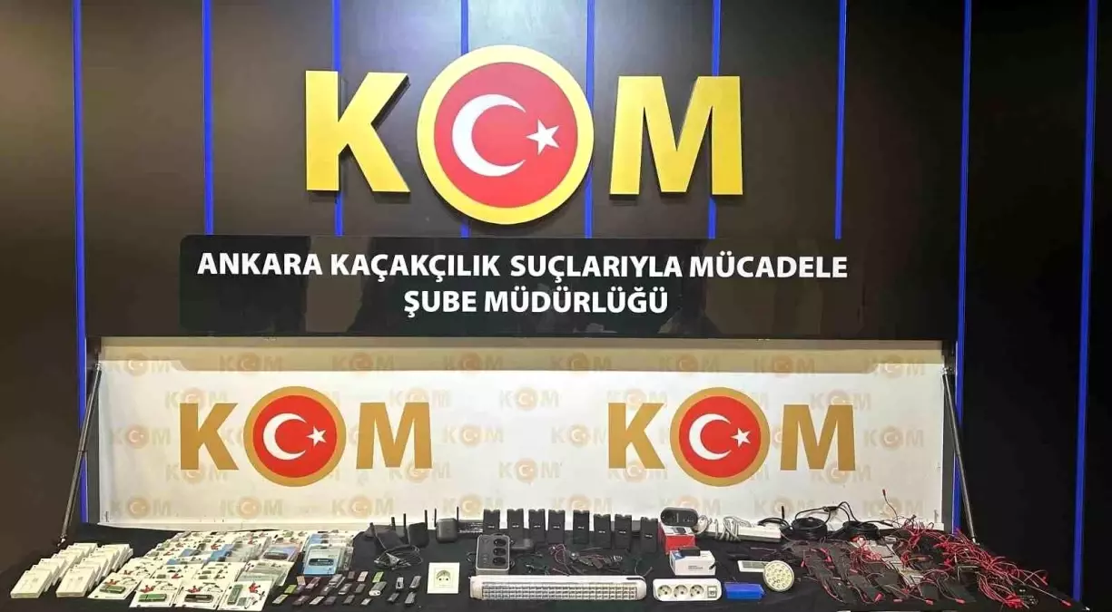 Edinilen bilgiye göre, Ankara Emniyet Müdürlüğü Kaçakçılık Suçlarıyla Mücadele Şube Müdürlüğü ekiplerinin firari olarak aranan kaçakçıları yakalamak üzere yürüttükleri çalışmalar sonucunda 1 Kasım tarihinde belirlenen bir adrese operasyon düzenlendi. Adreste yapılan arama sonucunda 12 adet dinleme ve görüntü alma cihazı yerleştirilmiş muhtelif eşya, 154 adet görüntü ve ses alma aparatı, 80 adet içerisine dinleme cihazı yerleştirilmiş taşınabilir bellek, 1 adet GPS cihazı, 3 adet yılan kamera, 8 adet şok cihazı, 3 adet güneş enerjili powerbank, 16 adet cep telefonu taşınabilir bellek kablosu olmak üzere toplam 277 adet ürün ele geçirildi. Operasyonda ise 1 şüpheli gözaltına alındı. - ANKARA