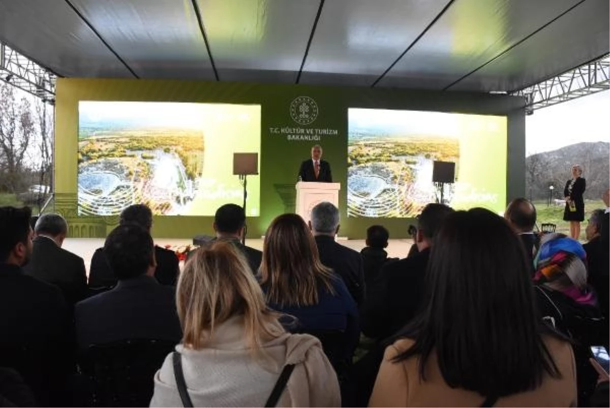 Aphrodisias'ın, anıtsal mimarisiyle ve müzede sergilenen sayısız heykeltıraşlık eserleri ile en göz alıcı antik kentlerden biri olduğunu ifade eden Bakan Ersoy, "Aphrodisias'ta kent parkı ve havuzun yanı sıra hemen yanımızda bulunan ve Aphrodisias'ın en ihtişamlı yapılarından biri olan Tetrastoon'da ise kazı ve restorasyon çalışmalarını başlatıyoruz. Antik dönemde Aphrodisias'taki Bazilika kentin en büyük kapalı binasıydı. Binanın ön cephesine odaklanan yeni bir proje ile devasa giriş sütunlarını ayağa kaldırma çalışmalarını 2023 yılında tamamlamış ve binanın cephesinde Diokletianus'un Tavan Fiyat Fermanı'nı sergilemiştik. Şimdi ise hazırladığımız yeni projeyle binanın kalan kısmında kazı yapacak, mozaiklerin konservasyonunu tamamlayacak ve sütunları ayağa kaldırarak yapının ziyaretçiler tarafından algılanmasını kolaylaştıracağız" ifadelerini kullandı.