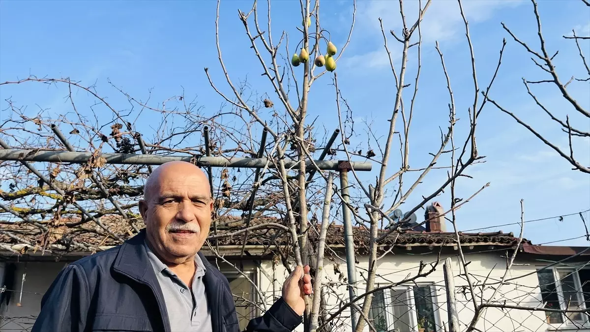 Çanakkale'nin Çan ilçesinde bir evin bahçesindeki armut ağacının temmuzun ardından kışın da meyve vermesi şaşırttı.