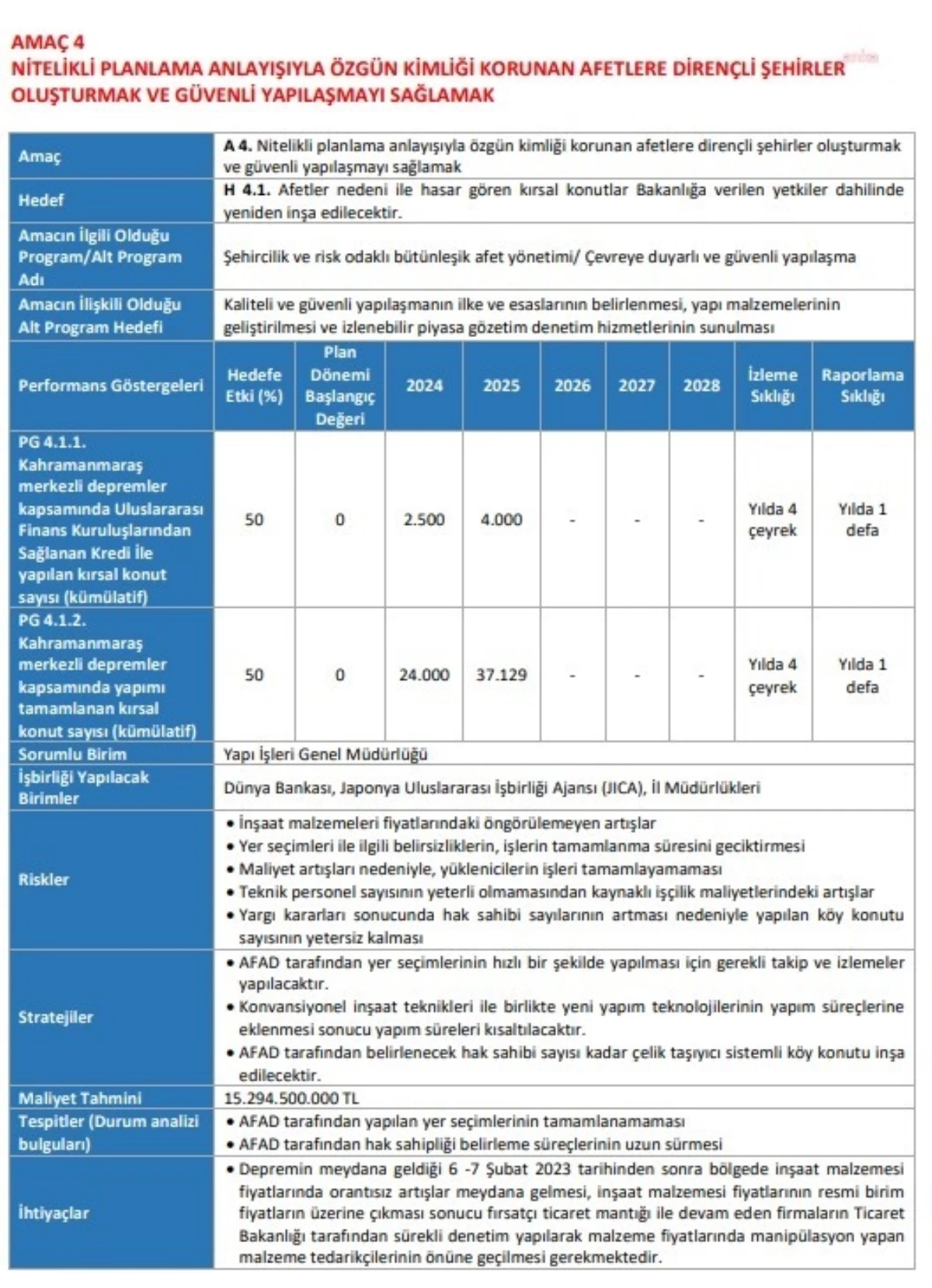 Çevre, Şehircilik ve İklim Değişikliği Bakanlığı tarafından yayınlanan 2024-2028 Stratejik Planı'nda, 'Nitelikli planlama anlayışıyla özgün kimliği korunan, afetlere dirençli şehirler oluşturmak ve güvenli yapılaşmayı sağlamak' başlığı kapsamında 6 Şubat depremlerinden sonra hasar gören kırsal konutların yeniden inşa edilmesinin hedeflendiği yer aldı.
