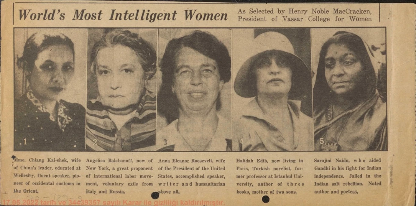 AA muhabirinin Cumhurbaşkanlığı Devlet Arşivleri başkanlığından aldığı bilgiye göre, Washington Daily News gazetesinin 31 Ağustos 1938 tarihli sayısında, Halide Edip Adıvar'ın Vassar Kadın Koleji tarafından, "dünyanın en zeki 5 kadını" arasında gösterildiğine ilişkin haber dikkati çekti.