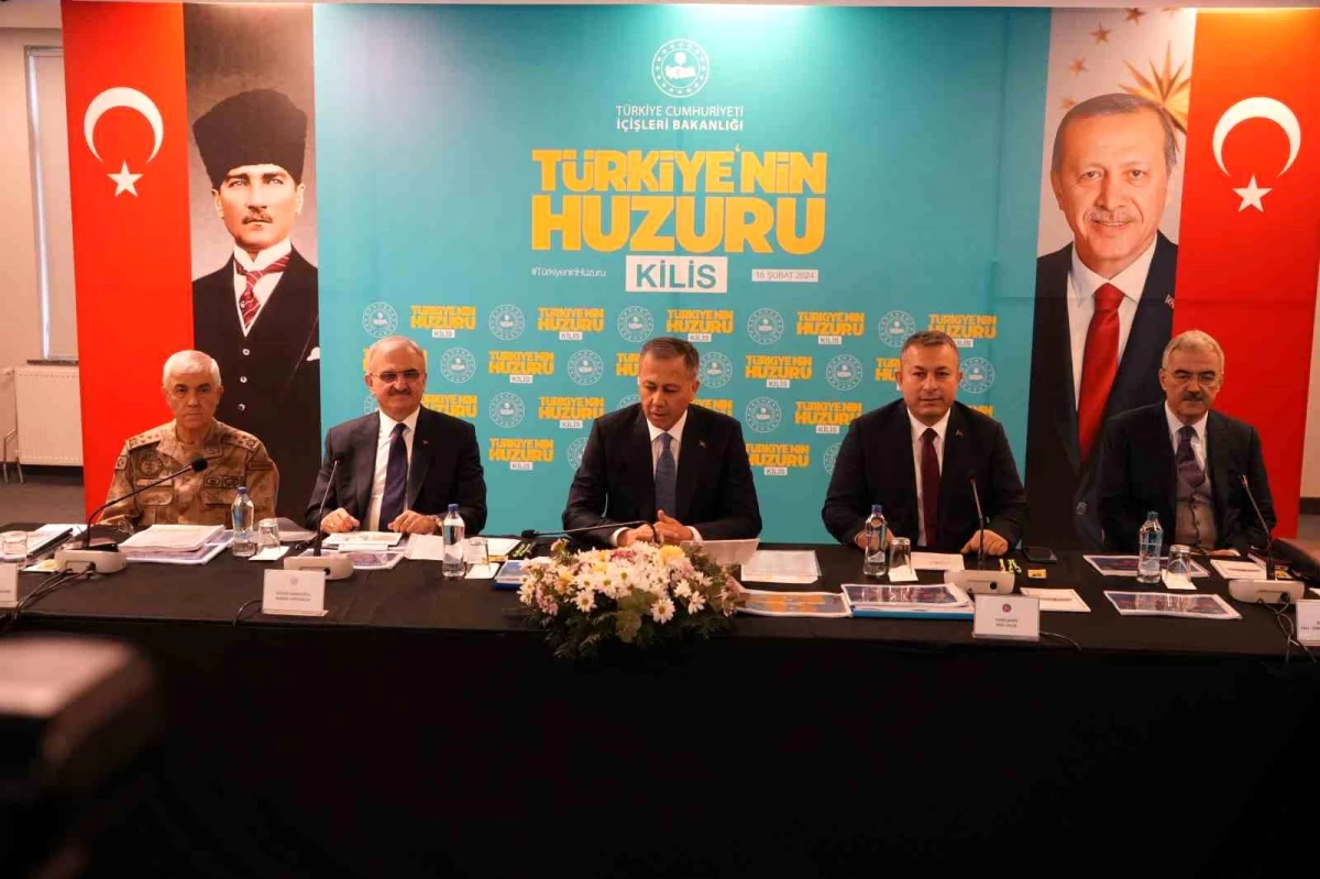 Basına kapalı olarak gerçekleştirilen güvenlik toplantısına, Jandarma Genel Komutanı Orgeneral Arif Çetin, Emniyet Genel Müdürü Erol Ayyıldız, İçişleri Bakan Yardımcısı Münir Karaoğlan, Kilis Valisi Tahir Şahin ve protokol üyeleri katılırken toplantıda, terör, kaçakçılık, uyuşturucuyla mücadele, asayiş, sınır güvenliği ve göç konularını ele aldı. Göçü durdurmak için yapılan çalışmaları durdurulmayacağını söyleyen İçişleri Bakanı Ali Yerlikaya, "Savunma Bakanlığımız Hudut duvarlarının ön tarafında geçişi daha da zorlaştırmak yapmış olduğu hendek çalışmalarını izledik ve bunların tamamını yüzde 40'a yakınının yapıldığını gördük ve bunlarla ilgili teknolojik kapasitemiz daha yukarıya çıkarmaya yönelik gayretlerimizi netleştirdik altını çizdik. Suriye gücüyle ilgili de Kilis Valiliğimizin yine Bakanlığımızın bir görev olduğunu da biliyorsunuz. Cerablus ve Azez tarafında 7 yıldan beri yapmak çok büyük hizmetler var gayretler var. Bu göçük kaynağında durdurma ile ilgili yapılan çalışmalar mucibi olduğunu tüm dünya biliyor ve biz bu noktada gerçekten kendi şehirlerimize kendi hudutlarımıza göçü durdurma ile ilgili yaptığımız bu çalışmalarımız devam ettireceğiz" dedi.