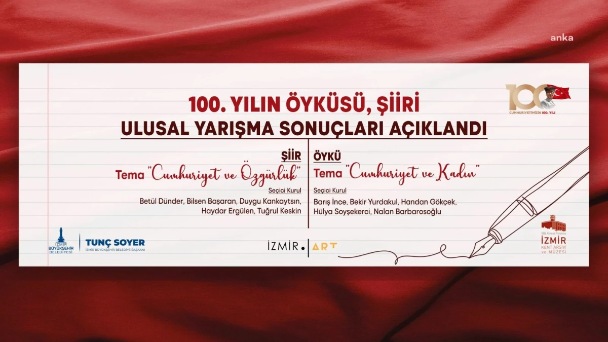 İzmir Büyükşehir Belediyesi'nin Cumhuriyet'in kurucu değerlerine ithafen düzenlediği "100. Yılın Öyküsü, Şiiri" adlı ulusal öykü ve şiir yarışmasında dereceye girenler açıklandı. Tarihi Asansör Ceneviz Salonu'nda bir araya gelen seçici kurul, gün boyu süren titiz değerlendirme sonucunda nihai sonuçları belirledi.