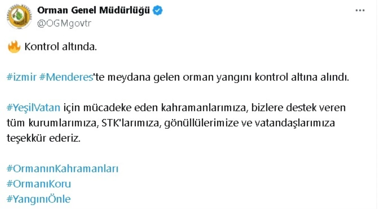 OGM'nin sosyal medya hesabından yapılan açıklamada, "İzmir Menderes'te meydana gelen orman yangını kontrol altına alındı. Yeşil vatan için mücadele eden kahramanlarımıza, bizlere destek veren tüm kurumlarımıza, STK'larımıza, gönüllülerimize ve vatandaşlarımıza teşekkür ederiz" denildi.