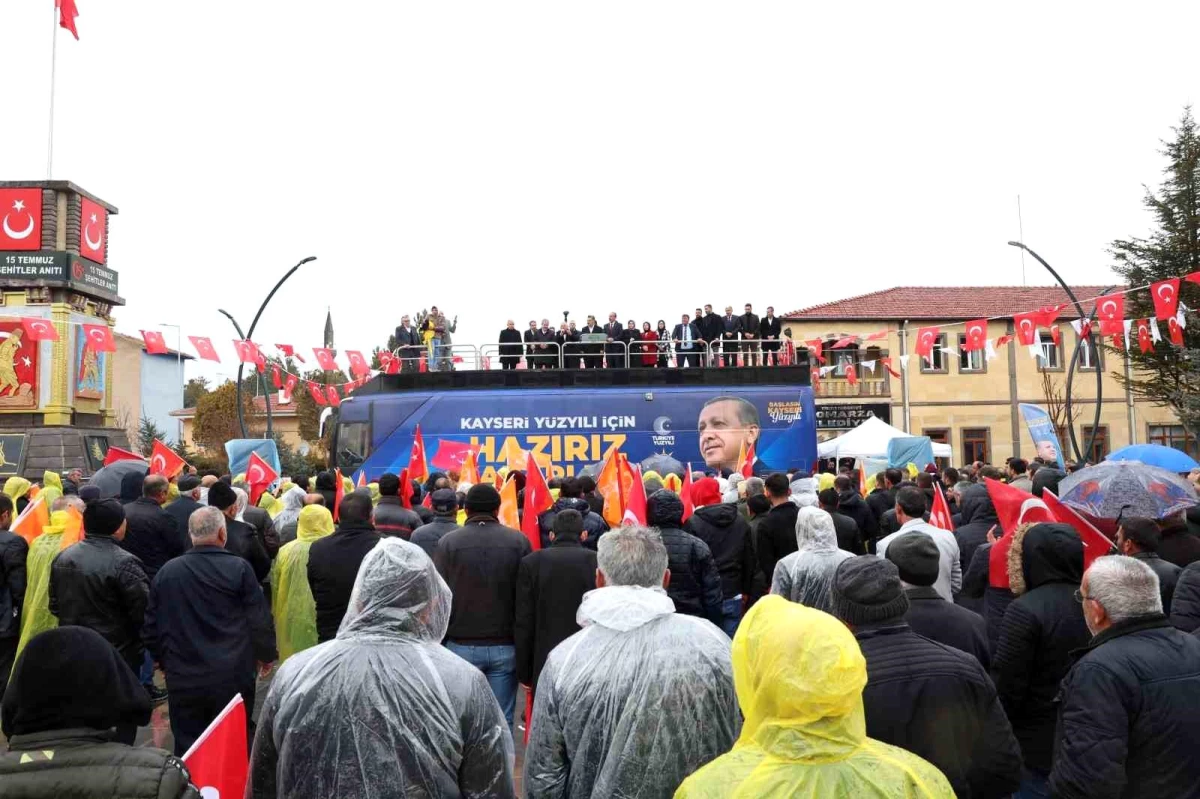 Yağan yağmur altında şemsiyeyi kaldırıp, 'beraber ıslanalım' diyerek konuşmasına başlayan AK Parti İl Başkanı Fatih Üzüm ise 5 yılda kırktan fazla hizmette sözünü gerçekleştirmiş olan ve yüz akı olarak nitelediği Tomarza Belediye Başkanı aynı zamanda adayı Davut Şahin'e başarılar diledi.