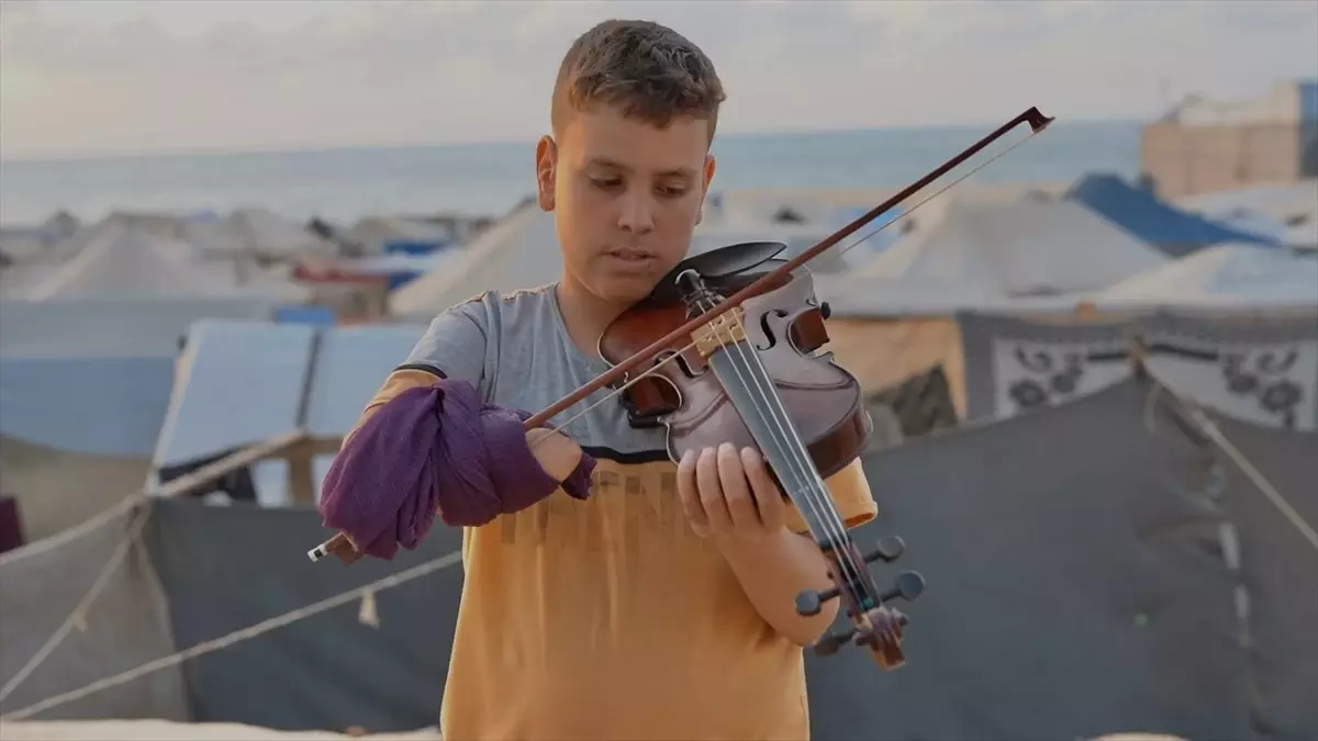 İsrail'in Gazze'nin orta kesimindeki Nusayrat Mülteci Kampı'nda bir okula düzenlediği saldırıda elini kaybeden 14 yaşındaki Muhammed Ebu Iyda, ampüte edilmiş eline kumaş parçasıyla bağladığı yay ile müzik aletini çalıyor.