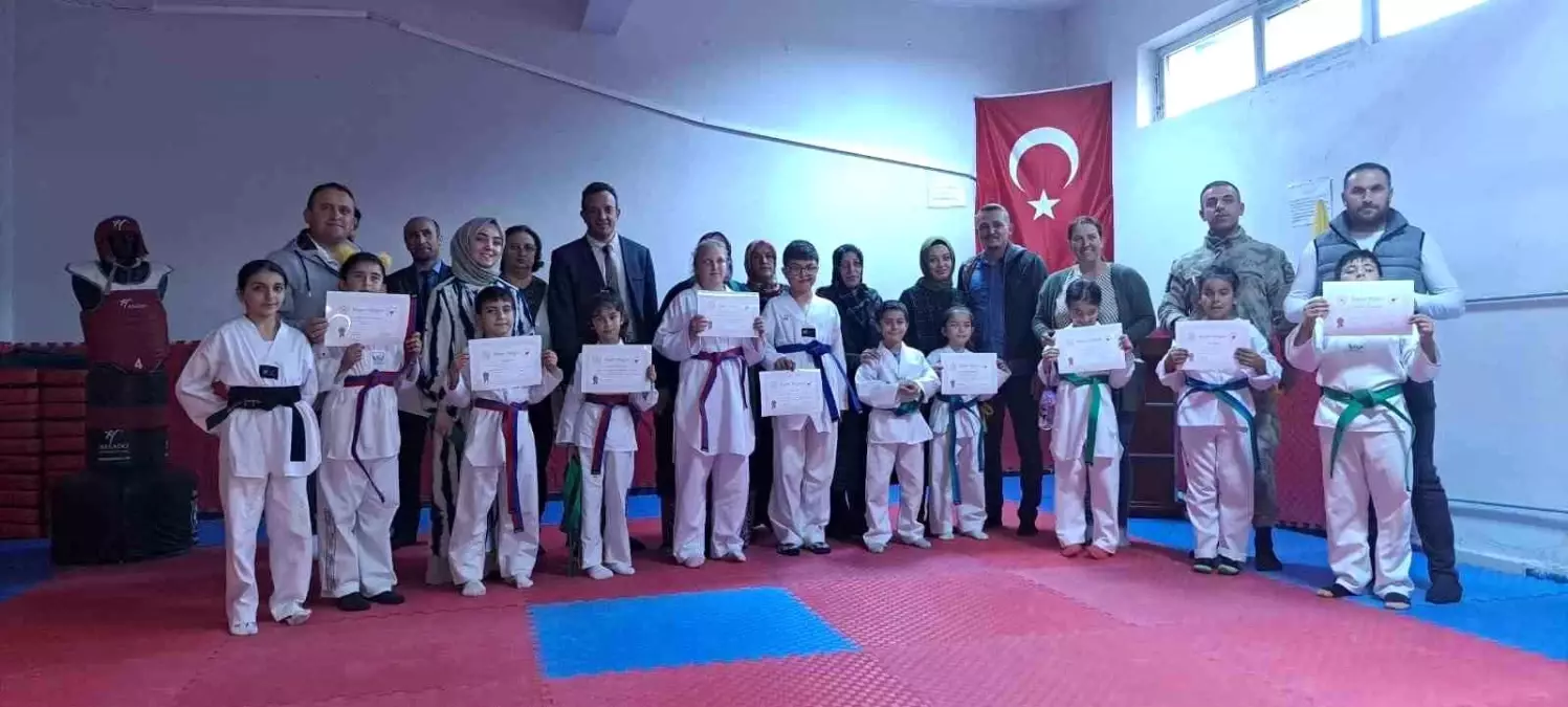 Ardahan'ın Posof ilçesinde minik taekwondocuların kuşak heyecanına aileleri de ortak oldu.