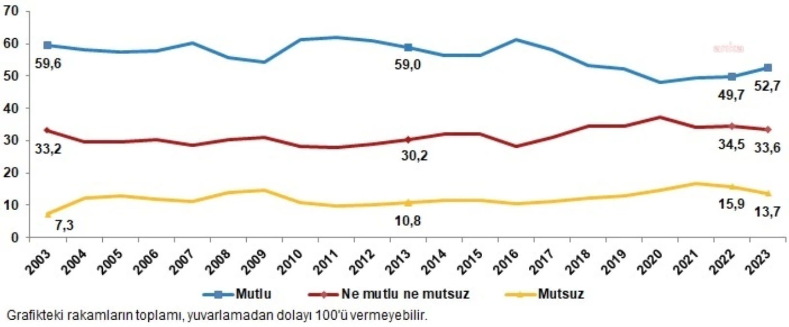 TÜİK "Yaşam Memnuniyet Araştırması, 2023" araştırmasının sonuçlarını açıkladı. Yaşam memnuniyeti araştırması sonuçlarına göre, mutlu olduğunu beyan eden 18 ve üzeri yaştaki bireylerin oranı, 2022 yılında yüzde 49,7 iken 2023 yılında 3,0 puan artarak yüzde 52,7 oldu. Mutsuz olduğunu beyan eden bireylerin oranı ise 2022 yılında yüzde 15,9 iken 2023 yılında 2,2 puan azalarak yüzde 13,7 olarak gerçekleşti. Mutlu olduğunu belirten evli bireylerin oranı, 2023 yılında yüzde 56,4 iken evli olmayanlarda bu oran, yüzde 45,8 olarak belirlendi. Evli olanların mutluluk düzeyi cinsiyete göre incelendiğinde; evli erkeklerin yüzde 53,2'sinin, evli kadınların ise yüzde 59,5'inin mutlu olduğu gözlendi.