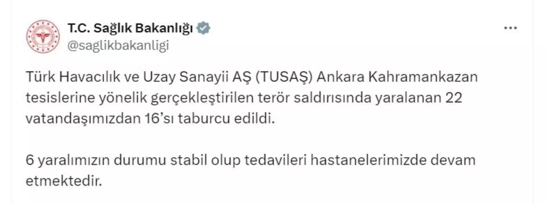 Bakanlığın sosyal medya hesabından yapılan açıklamada, "Türk Havacılık ve Uzay Sanayii AŞ (TUSAŞ) AnkaraKahramankazan tesislerine yönelik gerçekleştirilen terör saldırısında yaralanan 22 vatandaşımızdan 16'sı taburcu edildi. 6 yaralımızın durumu stabil olup tedavileri hastanelerimizde devam etmektedir" denildi.