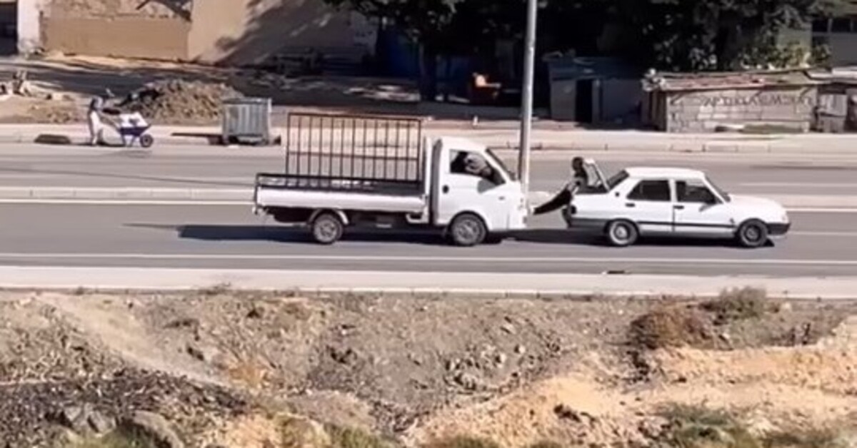 İsmi öğrenilemeyen sürücü, arıza yapan aracının bagajına oturdu ve pikaba ayaklarını dayadı. Pikabın ilerlemesi ile arızalı araç da hareket etmeye başladı.