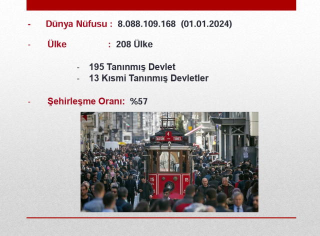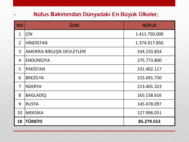Bu durum, genelde Küreselleşme diye tarif ediliyor. Biliyoruz ki; gelişmiş ülkeler, afetleri ve depremleri daha az can kaybı ile ve daha az hasarla atlatırken, geri kalmış ülkelerde felaketin boyutları daha büyük oluyor. Bu bakımdan gerek Dünya’ya gerekse Türkiye’ye şöyle bir bakalım: Dünyamızda yaklaşık 8 milyar insan yaşıyor. Bu nüfusun yaklaşık ¼’ü yani 2 Milyar’ı Müslüman. Yine Dünya’da yaklaşık 200 devlet var. Şehirleşme oranı % 57’lerde. Yani 8 milyarlık Dünya nüfusunun yaklaşık 5 Milyar’ı şehirlerde yaşıyor. Bu doğrultuda Dünya’ya kısaca bakalım; Nüfus bakımından Dünyadaki en büyük on ülke sırasıyla: Çin, Hindistan, ABD, Endonezya, Pakistan, Brezilya, Nijerya,Bangladeş, Rusya ve Meksika.