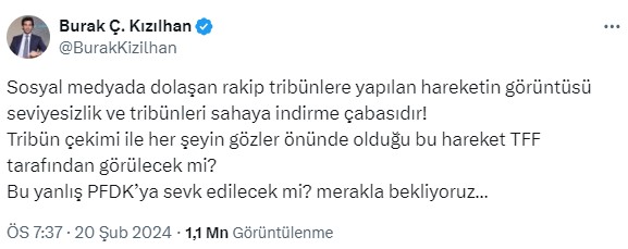 Fenerbahçe Yönetim Kurulu Üyesi Burak Kızılhan, Mauro Icardi’ye tepki göstererek PFDK’ya sevk edilmesini istedi. Sosyal medya hesabından yaptığı açıklamada, “Sosyal medyada dolaşan rakip tribünlere yapılan hareketin görüntüsü seviyesizlik ve tribünleri sahaya indirme çabasıdır! Tribün çekimi ile her şeyin gözler önünde olduğu bu hareket TFF tarafından görülecek mi? Bu yanlış PFDK’ya sevk edilecek mi? merakla bekliyoruz…” dedi.