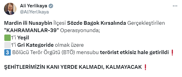 Yerlikaya’nın açıklamaları şu şekilde: “Aziz Milletimizin bilmesini isterim ki son Terörist Etkisiz Hale Getirilinceye Kadar Mücadelemize Sizlerin Duası ve Desteğiyle Kararlılıkla Devam Edeceğiz! Jandarma Genel Komutanlığı İstihbarat Başkanlığı ve Terörle Mücadele Daire Başkanlığı koordinesinde; Mardin İl Jandarma Komutanlığınca yapılan istihbarat çalışmaları sonucunda Nusaybin’in sözde Bagok Kırsalında, Hava Kuvvetleri Komutanlığı ve J-SİHA’ların desteğiyle JÖH, Jandarma Komando ve Güvenlik Korucusu Timlerinin katılımıyla “Kahramanlar-39” operasyonu düzenlendi.