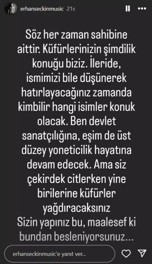 Pınar’ın eşi Erhan Seçkin ise “Söz her zaman sahibine aittir. Küfürlerinizin şimdilik konuğu biziz. İleride ismimizi bile düşünerek hatırlayacağınız zamanda kim bilir hangi isimler konuk olacak. Ben devlet sanatçılığına, eşim de üst düzey yöneticilik hayatına devam edecek. Ama siz çekirdek çıtlarken yine birilerine küfürler yağdıracaksınız. Sizin yapınız bu, maalesef ki bundan besleniyorsunuz” ifadelerini kullandı.