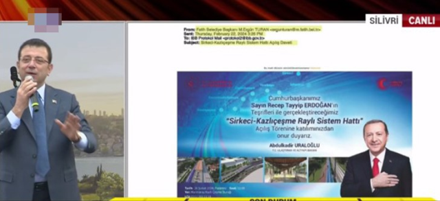 Silivri’de halk buluşmasında konuşan İmamoğlu ise kendisine Fatih Belediye Başkanı Ergün Turan tarafından gönderilen davet mailini ekrana yansıtarak Murat Kurum’a yanıt verdi.